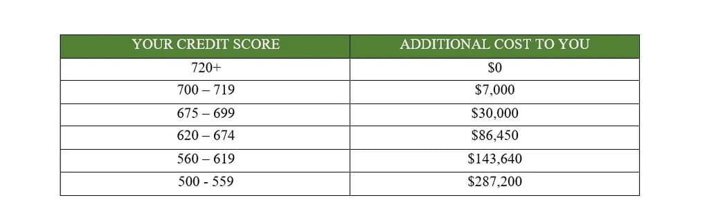 As you can see from the chart above, Bad credit can cost you thousands of dollars over time. Imagine if that 200K loan was a 500K loan or a $1M loan. Think about how much that would cost you over time with just having bad credit. If your credit score is not where you want it to be then please give us a call today at